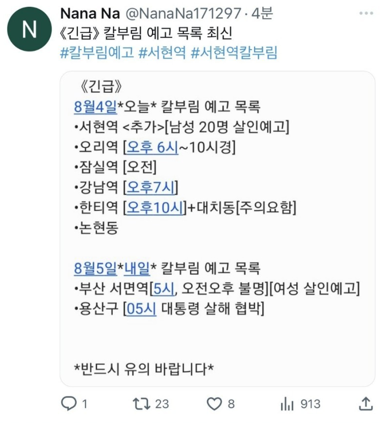 2023.08.04 - [실시간] 서울 강남 고속버스터미널 무차별 범행 예정자 검거