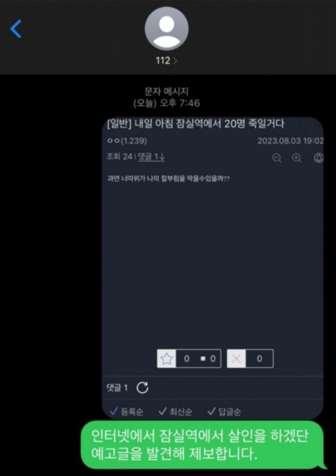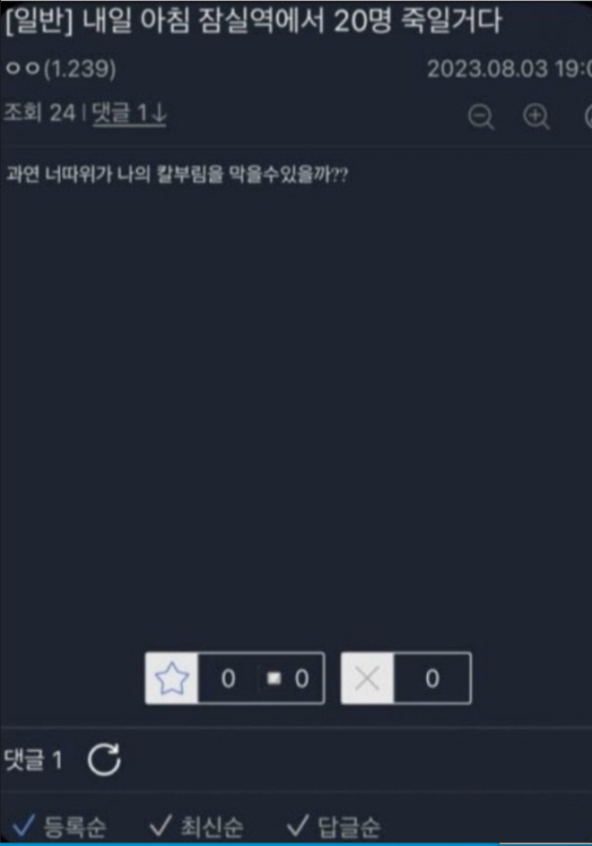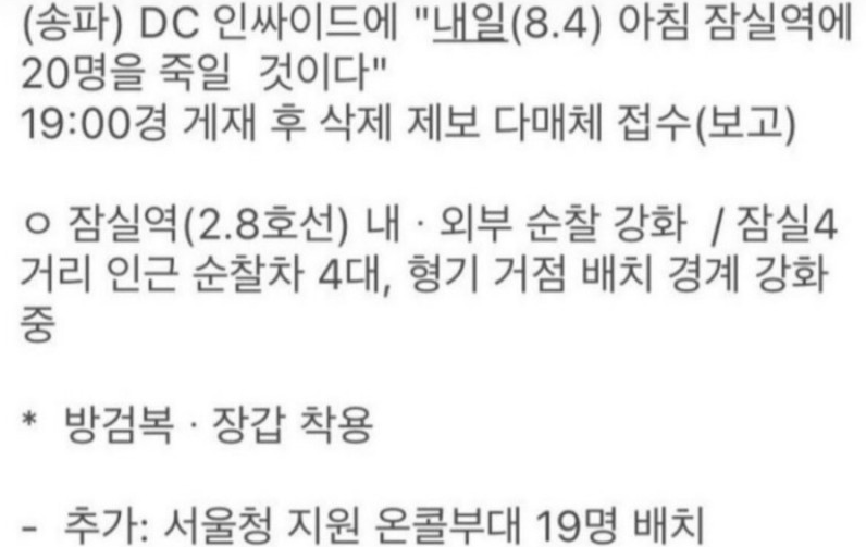 8월 3일 19시경쯤 디시에 올라온 잠실역 흉기난동 예고