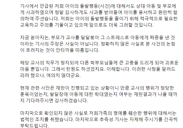 지금 쏟아지는, 부모가 교사를 달달볶아 그 스트레스로 아동에게 짜증을 낸 것이라는 기사의 주장은 사실이 아닙니다. 정확하지 않은 사실로 본 사건의 논점이 흐려지는 것이 안타까울 따름입니다.