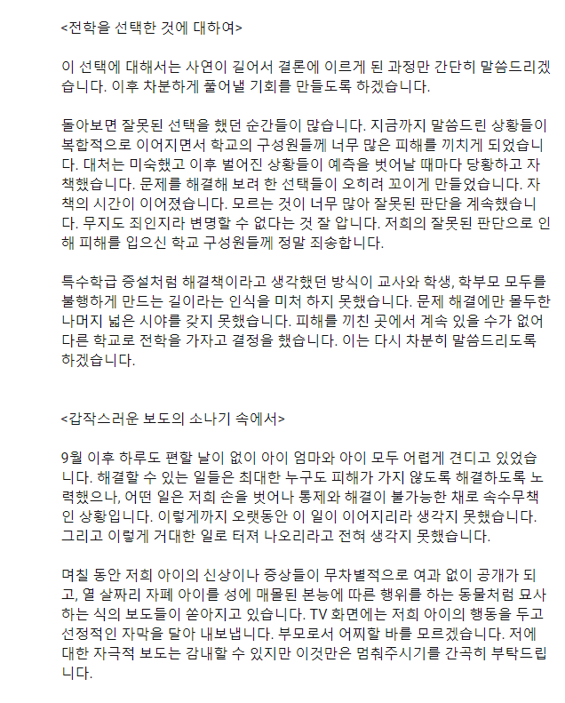 시간이 걸리더라도 다른 부모님들과 사건을 공유하고 해결책을 찾았어야 했는데 섣불렀고 어리석었습니다. 저희는 빠르게 특수교사가 대체되기를 희망했으나 특수교육 쪽은 특히나 인력이 너무 부족한 상황이라 교사를 구하기가 어려웠습니다. 교육의 공백이 길어지면서 다른 부모님과 아이들에게 많이 힘든 상황이 벌어졌습니다. 이에 대한 분노와 원망은 당연한 것이라 저희가 달게 받아들이고 있습니다. 아이들과 부모님들께 정말 죄송합니다. 서로 의지하던 사이인 부모님들과 상의하지 못한 점 정말 죄송합니다. 앞으로도 계속 사죄드리고 반성하면서 살겠습니다.