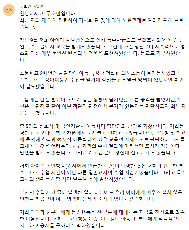 자폐아들 특수교사 고소 사건 관련 주호민 두번째 입장문