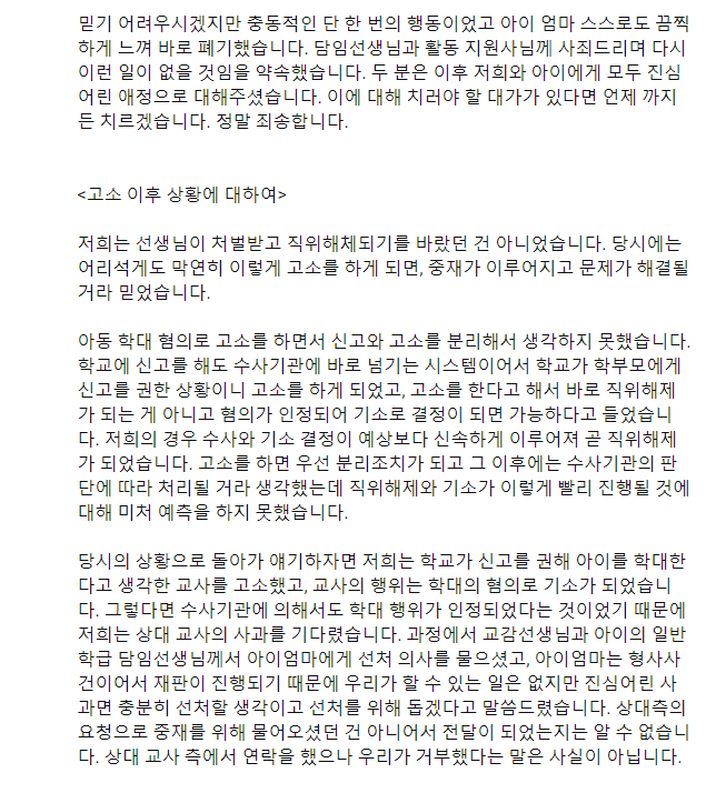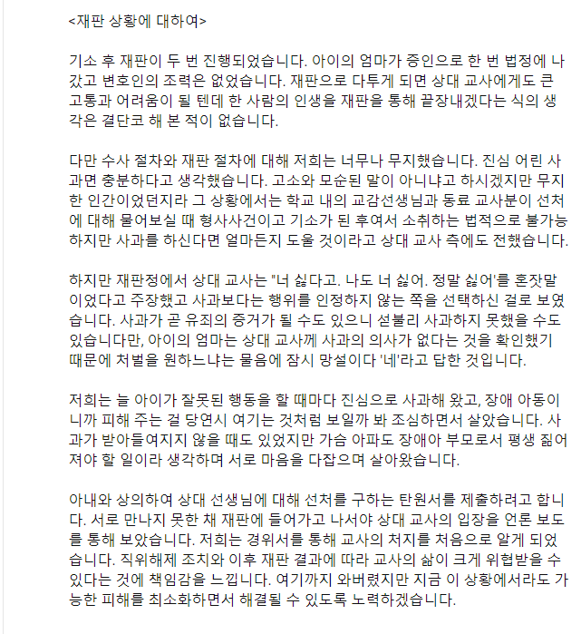 다만 수사 절차와 재판 절차에 대해 저희는 너무나 무지했습니다. 진심 어린 사과면 충분하다고 생각했습니다. 고소와 모순된 말이 아니냐고 하시겠지만 무지한 인간이었던지라 그 상황에서는 학교 내의 교감선생님과 동료 교사분이 선처에 대해 물어보실 때 형사사건이고 기소가 된 후여서 소취하는 법적으로 불가능하지만 사과를 하신다면 얼마든지 도울 것이라고 상대 교사 측에도 전했습니다.