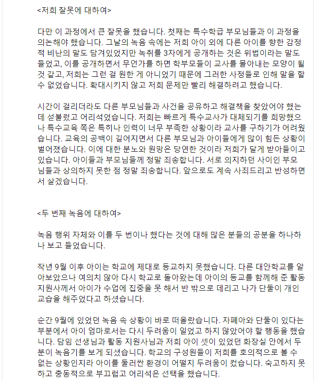 다만 이 과정에서 큰 잘못을 했습니다. 첫째는 특수학급 부모님들과 이 과정을 의논해야 했습니다. 그날의 녹음 속에는 저희 아이 외에 다른 아이를 향한 감정적 비난의 말도 담겨있었지만 녹취를 3자에게 공개하는 것은 위법이라는 말도 들었고, 이를 공개하면서 무언가를 하면 학부모들이 교사를 몰아내는 모양이 될 것 같고, 저희는 그런 걸 원한 게 아니었기 때문에 그러한 사정들로 인해 말을 할 수 없었습니다. 확대시키지 않고 저희 문제만 빨리 해결하려고 했습니다.